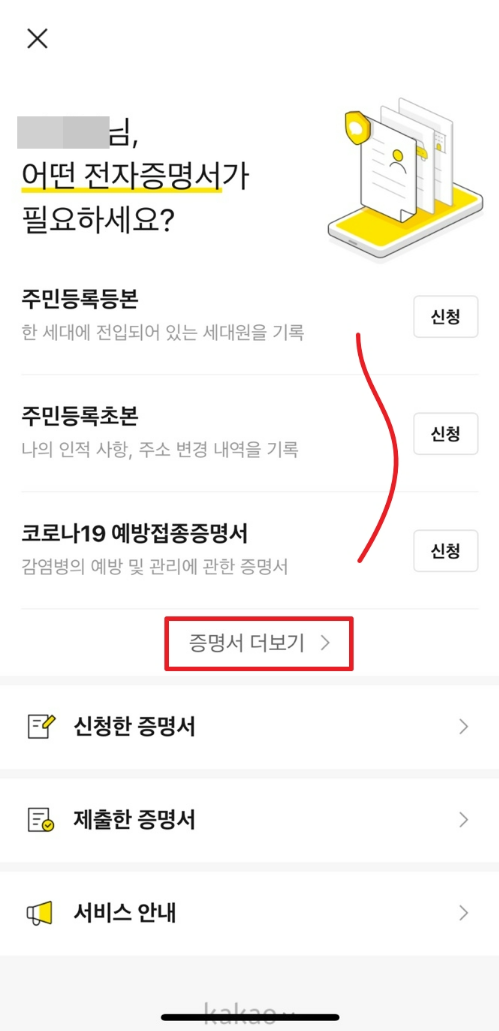 일단 먼저 카카오에서 접근가능한 증명서가 어떤게 있는지 확인해보겠습니다.