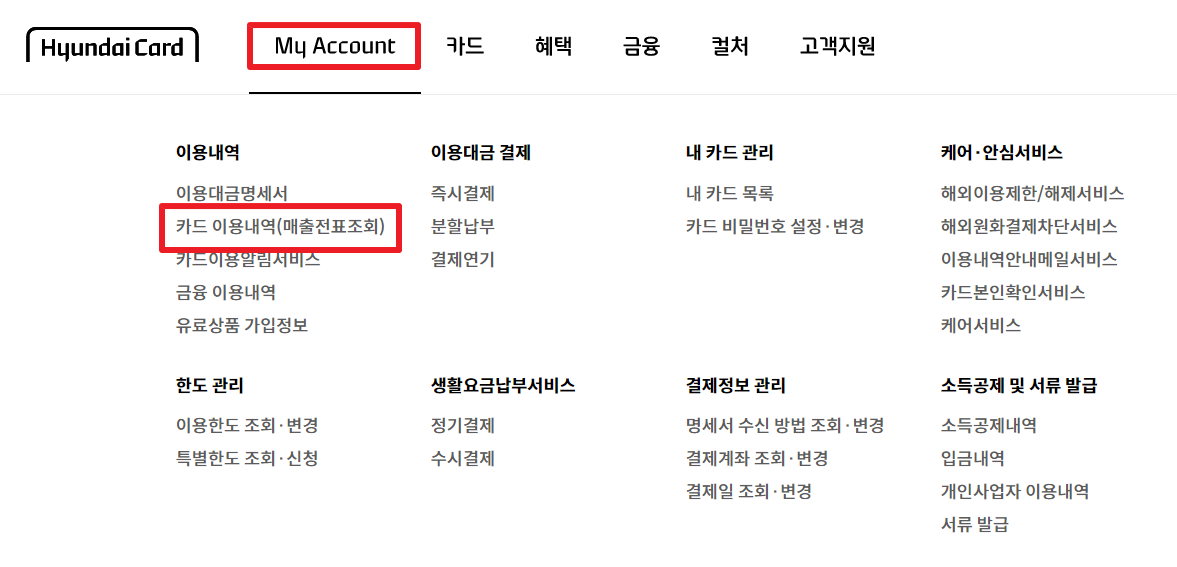 2. 상단 My Account> 카드 이용내역(매출전표조회)을 클릭합니다.