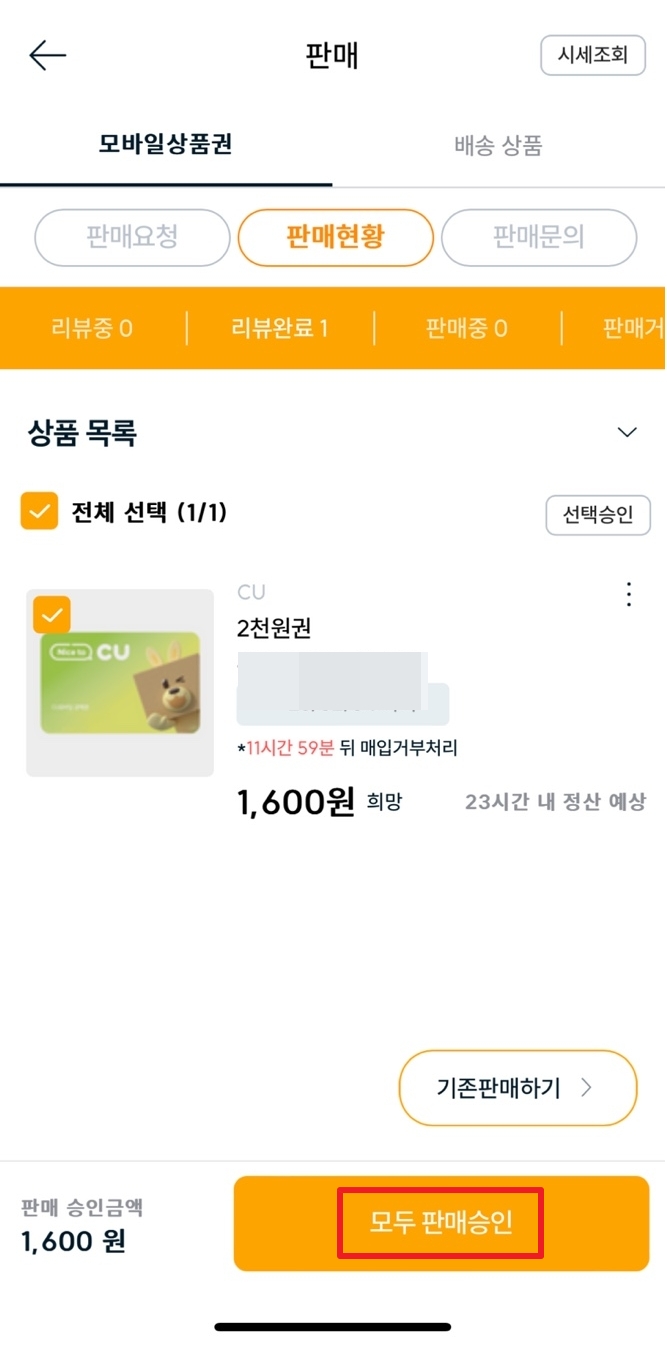 7. 판매할 상품 및 정보를 확인한 후 [모두 판매승인] 버튼을 클릭합니다.