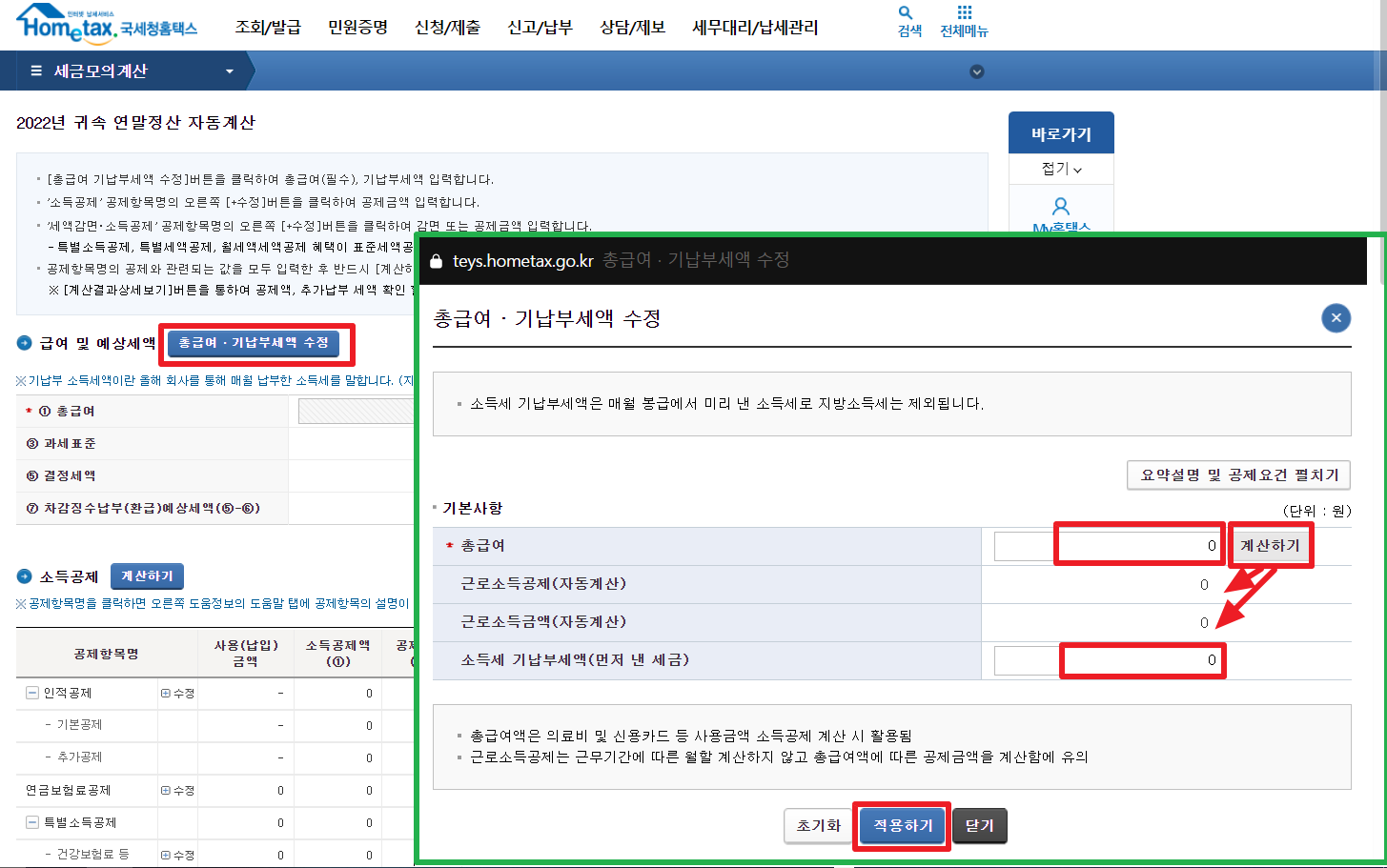 소득세 기납부세액(먼저 낸 세금이며 지방소득세 제외)을 입력 후 [적용하기] 버튼을 클릭하여 창을 나옵니다.