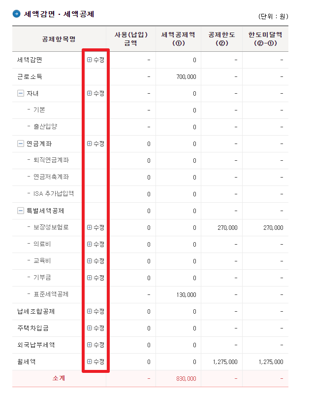 5. 소득공제 영역과 세액감면/세액공제 영역에 자신의 연말정산 간소화 자료항목을 해당하는 항목의 [+수정] 버튼을 클릭하여 입력합니다.