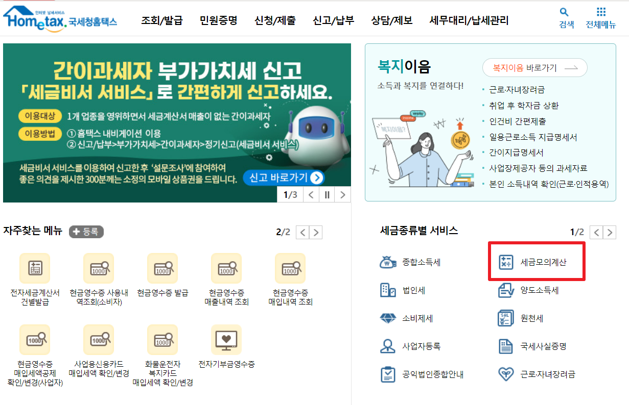 2. 세금종류별 서비스 란에서 [세금모의계산] 버튼을 클릭합니다.