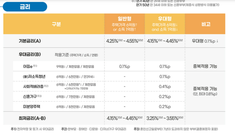 우대형 상품은 만 39세 이하에 주택가격 6억 원 이하 및 부부합산 소득 6000만 원 이하인 '저소득청년'은 0.1% 우대금리 적용, 한부모·장애인·다문화·다자녀가구 등 '사회적 배려층'(0.4% 포인트 적용), 결혼예정자를 포함해 혼인신고일로부터 7년 이내인 '신혼가구'(0.2% 포인트 적용), 미분양주택(0.2% 포인트적용) 등에 대한 우대금리가 있기에 최저 연 3.25~3.55% 금리로 이용 가능합니다. (우대사항은 중복적용 가능)